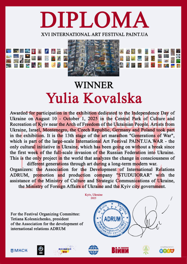 This painting is the winner of the qualifying competition andthe participant of the exhibitions of winners of the XV International Art Festivals MALUY.UA (24.05 — 9.08.2025) and XVI International Art Festivals MALUY.UA, (10.08 — 1.10.2025) held in the Central Park of Culture and Recreation in Kiev; Participant of the international art exhibition ‘Generations of War. The Fourth Year’ as part of the XI International Festival of Ukrainian Culture ‘Ucraina Fest’. Barcelona, Spain (9-15.09.2025); ; Participant of the All-Ukrainian Painting Exhibition ‘Unbreakable and Independent’in Lviv (August-September 2025)